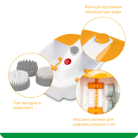 Пристрій масажує стопи за допомогою теплих бульбашок, вібрації, роликів на дні та інфрачервоного нагріву, а також дозволяє виконати педикюр завдяки трьом змінним насадкам: пемзі, масажеру й щіточці. Ванночка підтримує постійну температуру води, тож вам не доведеться доливати гарячу воду вручну.