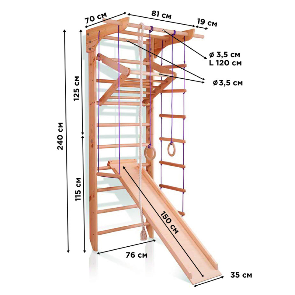 | Додаткова комплектація | Канат, Мотузкові сходи, Кільця гімнастичні, Турнік, Трапеція, Рукохід, Прес, Гірка |