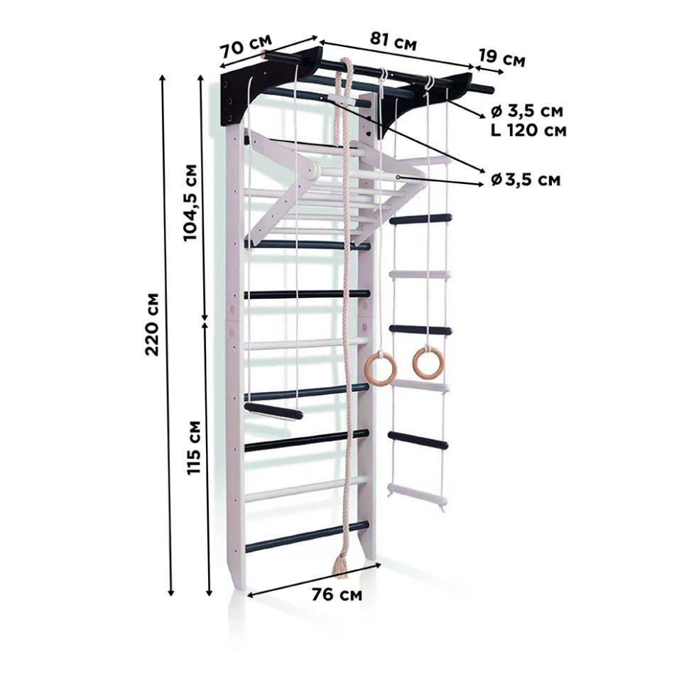 | Додаткова комплектація | Канат, Мотузкові сходи, Кільця гімнастичні, Турнік, Трапеція, Рукохід |