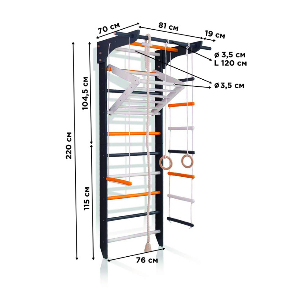 | Додаткова комплектація | Канат, Мотузкові сходи, Кільця гімнастичні, Турнік, Трапеція, Рукохід |